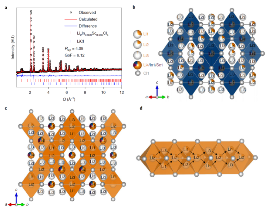 Li2In1-3Sc1-3Cl4的結(jié)構(gòu)和可能的鋰離子擴(kuò)散途徑
