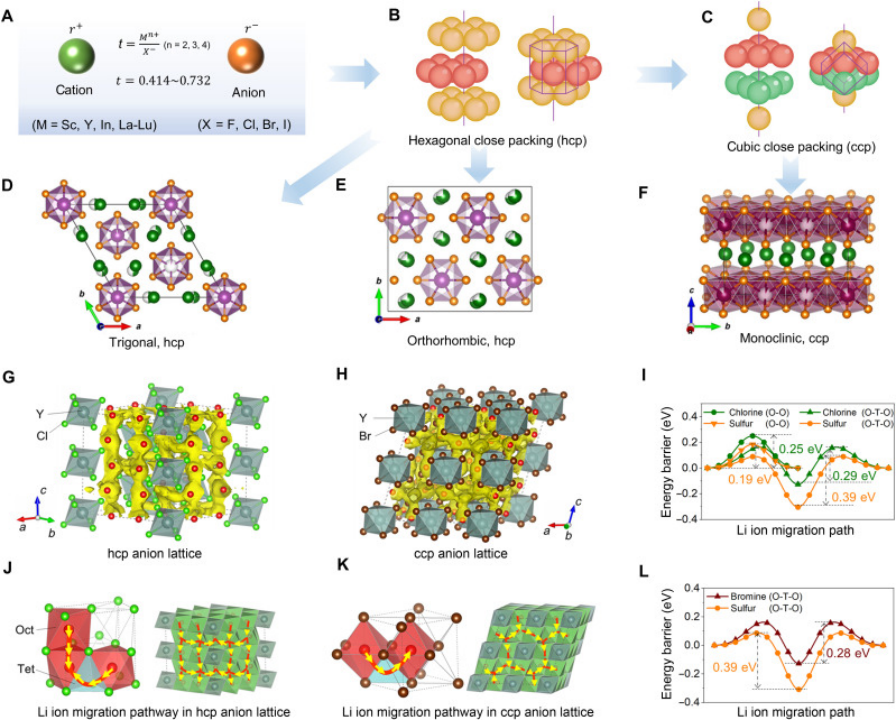 (A)正負(fù)離子晶體半徑比;(B)鹵素離子的六方密排結(jié)構(gòu);(C)鹵素離子的立方密排結(jié)構(gòu);(D)含hcp陰離子排列的三角晶體結(jié)構(gòu)(Pm1);(E)含hcp陰離子排列的正交晶體結(jié)構(gòu)(Pnma);(F)含ccp陰離子排列的單斜晶體結(jié)構(gòu)(C2/m);(G)Li3YCl6(類似hcp的陰離子晶格)和(H)Li3YBr6(類似cp的陰離子晶格)的晶體結(jié)構(gòu)。黃色標(biāo)記為AIMD模擬得到的Li+概率密度;(I)在hcp亞晶格中單個(gè)Li+遷移的能量分布圖;(J)Li3YCl6中Li+的遷移路徑;(K)Li3YBr6中Li+的遷移路徑;(L)ccp亞晶格中單個(gè)Li+遷移的能量分布圖。